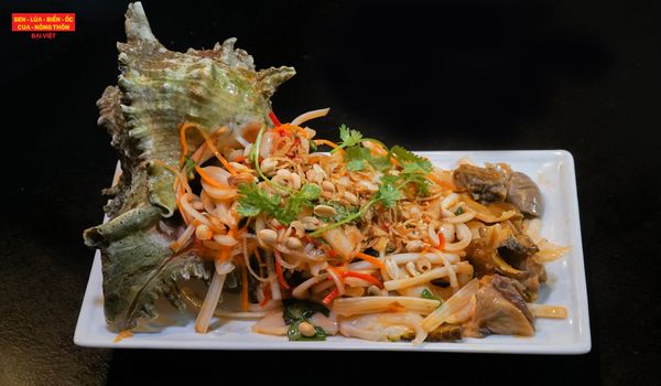 A refreshing contrast to grilled seafood, this Vietnamese salad combines tender slices of giant ramose murex snail (ốc gai đại) with julienned banana blossom, shredded herbs, and roasted peanuts. Tossed in a classic fish sauce-lime dressing with a touch of chili and garlic, the dish is light yet flavorful. It balances texture — chewy snail, crisp blossom, soft herbs — with bright acidity and umami. As one of the more refined seafood salads on our menu, it’s both healthy and deeply rooted in Vietnamese culinary tradition.