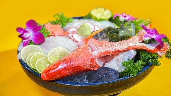 Món sashimi luôn là thước đo độ tươi của nguyên liệu. Với cá mú đỏ, sashimi trở thành tuyệt phẩm. Từng lát cá thái mỏng đều tay, bày trí trên đá lạnh, kèm mù tạt, gừng hồng và nước tương đặc chế của nhà hàng. Thực khách sẽ cảm nhận rõ độ ngọt tự nhiên, vị béo nhẹ, thanh mát nơi đầu lưỡi, rất khó nhầm lẫn với bất kỳ loại sashimi nào khác.