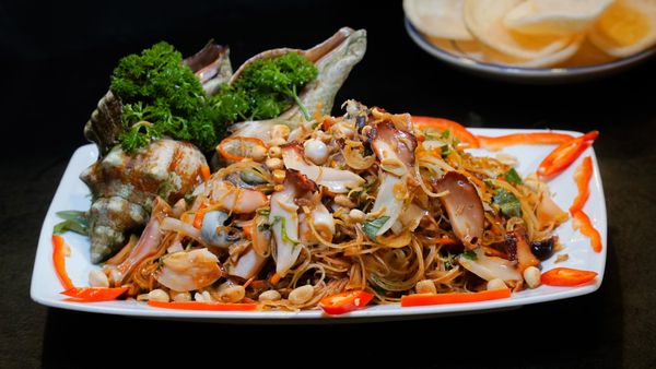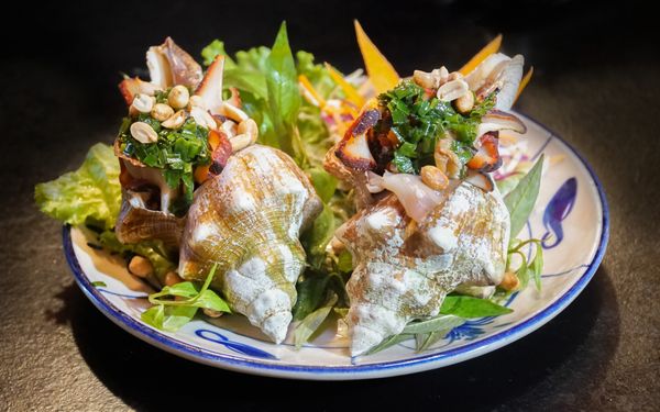 Một sự kết hợp dân dã nhưng đầy sáng tạo: ốc đỏ thái sợi trộn cùng bắp chuối non, rau thơm, đậu phộng rang và nước mắm chua ngọt. Món ăn mang đến cảm giác “vừa quen vừa lạ”, khiến thực khách ngỡ như đang dùng bữa nơi vùng quê nhưng lại cảm nhận rõ tinh hoa của biển cả.