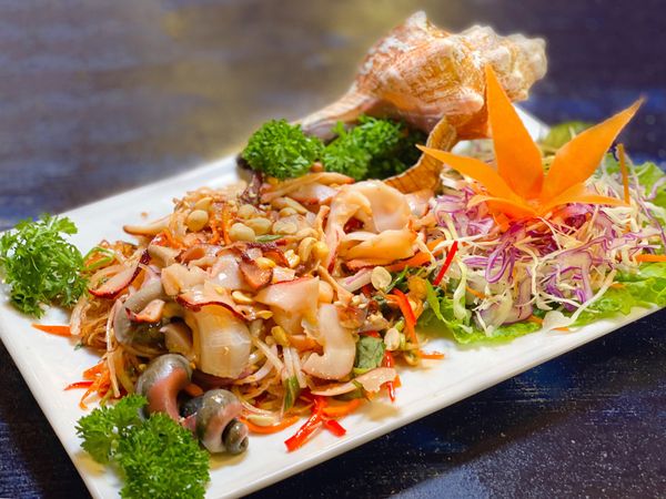 Gỏi Thái ốc đỏ đại là sự kết hợp tinh tế giữa thịt ốc tươi thái mỏng trộn cùng hành tây, rau răm, ớt, nước cốt chanh và sốt Thái đặc biệt. Món ăn này vừa chua nhẹ, cay nồng, lại giữ nguyên được độ giòn và vị ngọt của ốc đỏ – rất phù hợp để khai vị hoặc làm món nhậu mát lạnh.