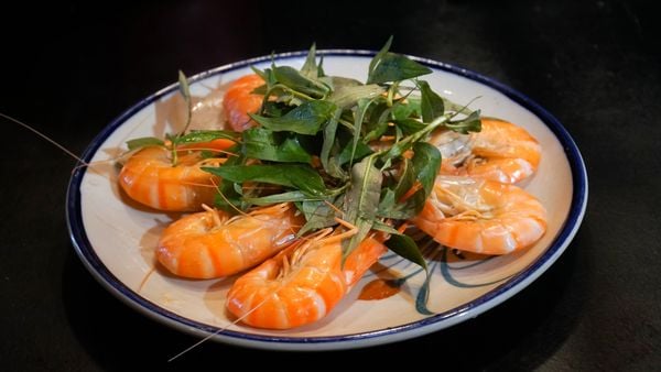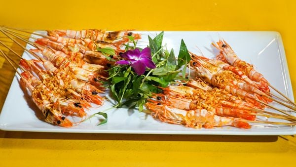 Món ăn tưởng chừng đơn giản nhưng lại chính là “bài test” chân thực nhất cho độ tươi của tôm sú. Không cần ướp hay tẩm gia vị, tôm chỉ được đem nướng trên than hồng đến khi lớp vỏ chuyển màu đỏ cam, bốc mùi thơm ngậy. Khi ăn, chỉ cần bóc vỏ và chấm cùng muối tiêu chanh là đã đủ đánh thức toàn bộ vị giác.