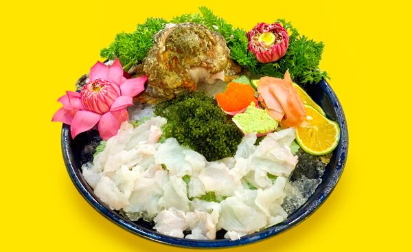 Delicate slices of raw stonefish are arranged like flower petals on crushed ice, served with wasabi, soy sauce, and pickled ginger. The texture is firm yet creamy, and the flavor is surprisingly clean with a subtle sweetness.